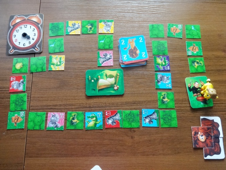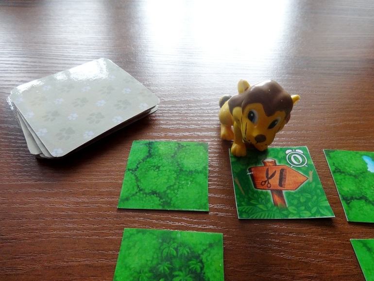 Ксюше игра очень-очень понравилась, играли уже много раз. Вкратце: необходимо выстроить дорогу для льва от его логова до парикмахерской. Затем по очереди открывая карты, вести льва по дороге. Если цвет карты и цвет открытого тайла дороги совпал, то лев не задерживаясь проходит дальше, если нет - то наш Лёва остановился поболтать (как долго будет болтать, отмечено цифрой на тайле, столько времени отмеряем на часах).