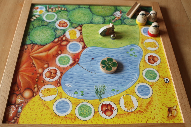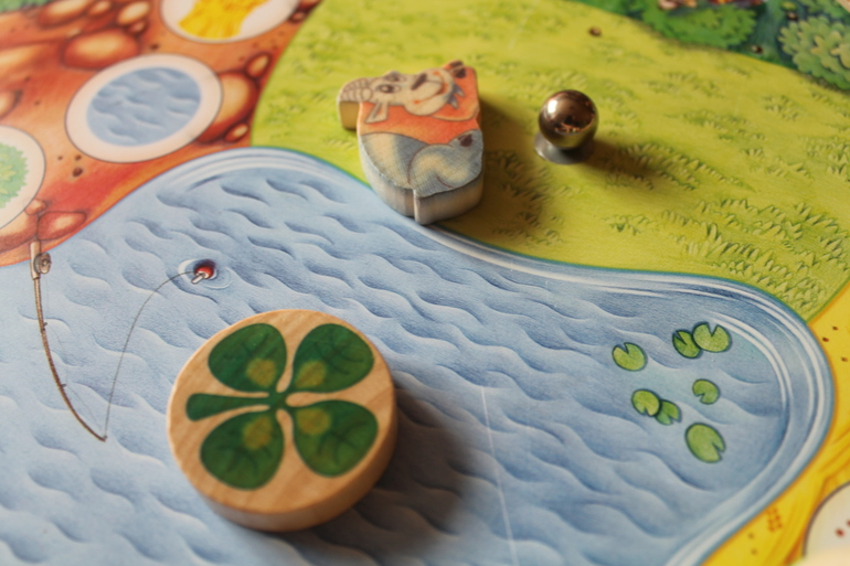 Первый, у кого Козлик попадет на озеро, получает фишку с листочком и ставит свою фигурку на эту фишку. Эта фишка помогает фигурке остаться на месте, когда Беппо в нее попадает.