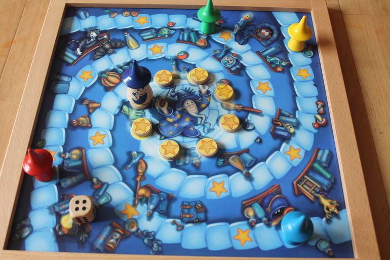Игра на память. В соответствии с выпавшим на кубике числом, игрок передвигает Волшебника по кругу фишек по или против часовой стрелки. Затем он поднимает колпак Волшебника и смотрит на цвет: зеленый или красный. Если зеленый, то игрок передвигает свою фигурку на такое же количество вперед, если красный - фигурка игрока перемещается назад.