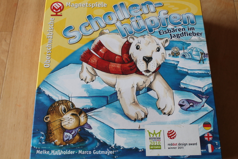 Интересная игра на память. Белые медведи прыгают с льдины на льдину (количество ходов указано на карточке), пытаясь поймать себе рыбку. За каждую пойманную рыбу (на обратной стороне льдины) игрок получает 1 очко. Но если вместо рыбы попался тюлень , 1 очко у игрока отнимается.