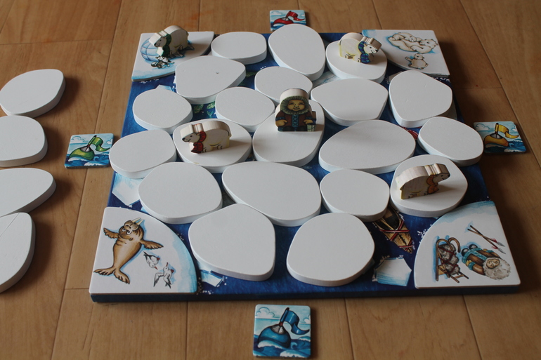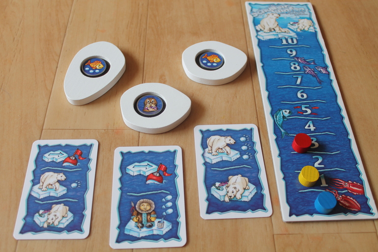 А еще в охоту медведей вмешивается Эскимос. С Эскимосом есть два варианта игры: 1. Если эскимос попал на льдину с Белым медведем, то Мишка перемещается на свой старт. 2. Эскимос перемещается на пустую льдину, и игроки пытаются вспомнить или угадать, что находится под этой льдиной: рыбка, тюлень или совсем ничего нет. Тот, кто правильно называет, зарабатывает 1 очко.