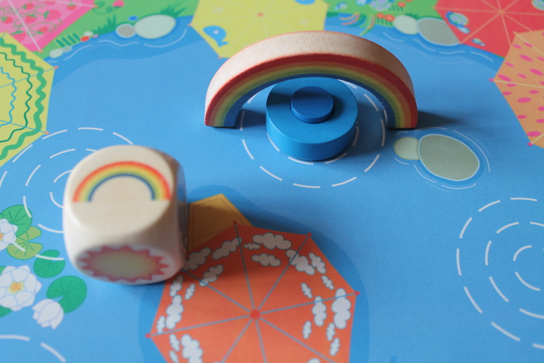 В зависимости от выпавшего значения на кубике (простой дождик, гроза, солнышко, облачко, радуга), игрок выполняет необходимое действие: расположить одну из частей капельки на поле, забрать с поля любую часть капельки, пропустить ход или установить радугу над любой капелькой (теперь это место защищено, нельзя ни добавлять части капельки, ни убирать).
