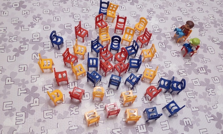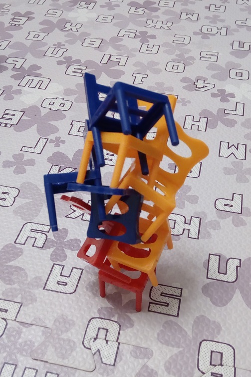 Ну и играем по правилам. Стульчик на стульчик, стульчик на стульчик. Проиграл медведь, который теремок разрушит.