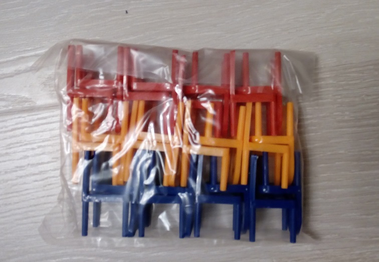 Упаковка без воздуха (19,5х14,5х3,5 см). Внутри 24 стульчика трех цветов.