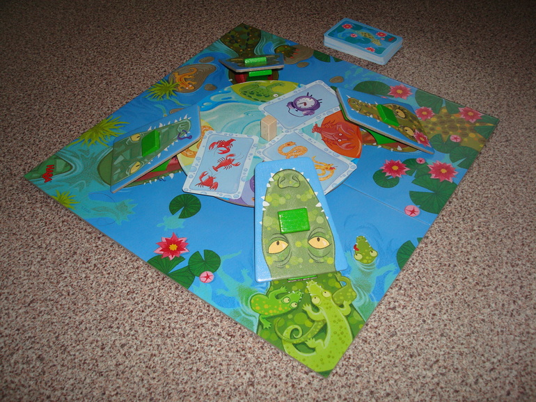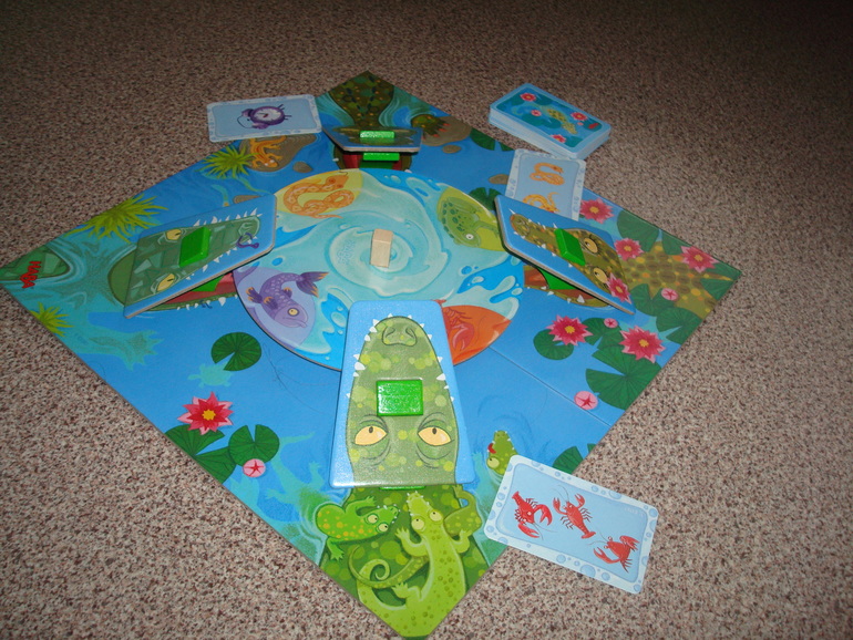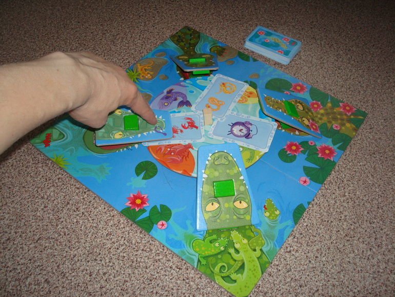 Ребёнка игра заинтересовала. Компоненты выполнены замечательно. НО поиграть так и не удалось, потому что, как только Вы раскручиваете волчок - водоворот, гладкие карточки с добычей слетают с него с космической скоростью ещё до того, как Вы успеваете опомниться. Вот, как не крути, слетают и всё тут… А голодные крокодилы вынуждены щёлкать пастью по пустому водовороту.