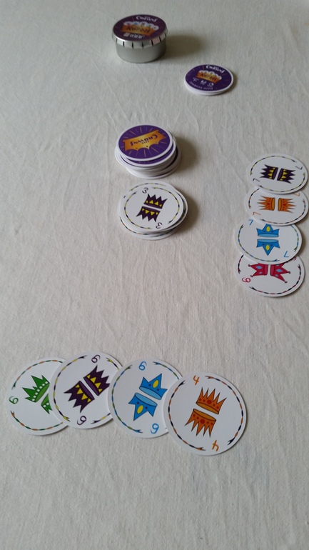 Я взяла из стопки 7 голубую и теперь я могу составить гвардию из семерок + джокер. поэтому 9 фиолетвую сбрасываю