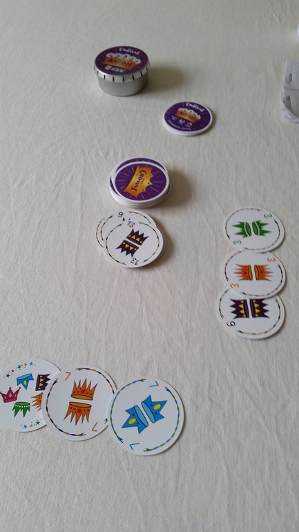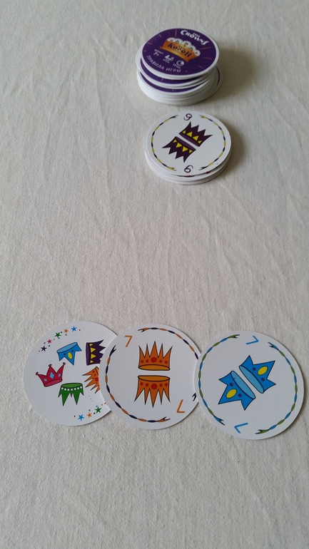 1 раунд - надо собрать последовательность (Гвардию или Свиту) из 3х карт (в этом раунде королевская карта - тройка, т.е. заменяет любую карту любого цвета, "дополнительный" джокер своего рода)