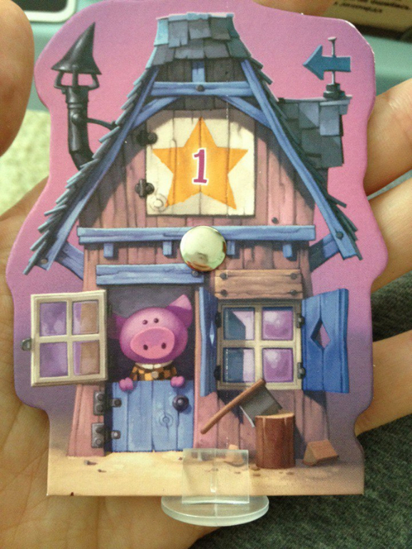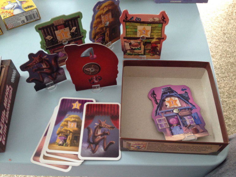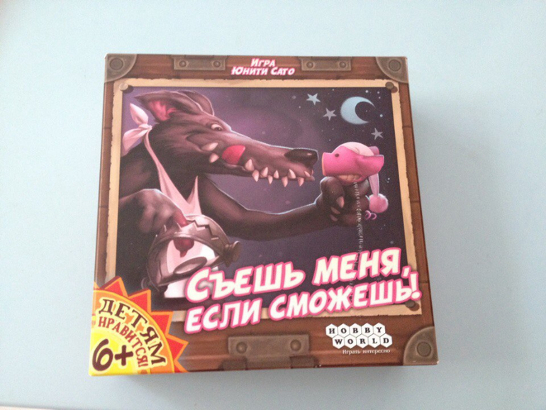 Съешь меня,если сможешь- давно ее заприметила.Невероятно стильные и смешные рисунки. Я всегда улыбаюсь глядя на ее карточки и нежно берегу игру. Смысл игры в том,что на обороте каждой фигурки с домиком есть указатель. И перед каждой ночью игроки решают,что они будут делать-спокойно спать или ставить капкан на волка. если поставить капкан,а волк не придет-минус очки,а если не поставить,то вообще слопает)))но в игре есть некоторые нюансы,что делает ее весьма веселой и интересной))))Миша очень любит волка,заявляет,что он его друг,поэтому эта игра горячо любима.По правилам пока не играем,а скорее инсценируем пока сказку.