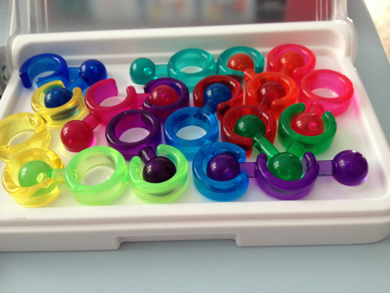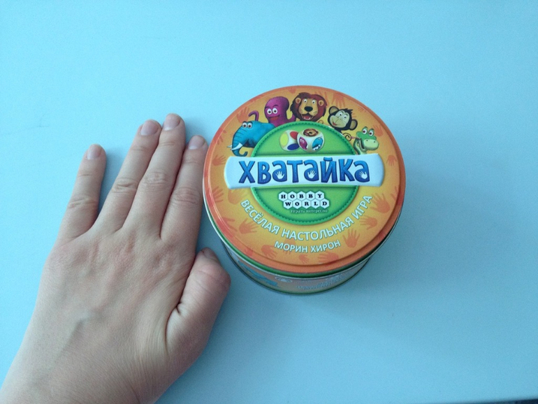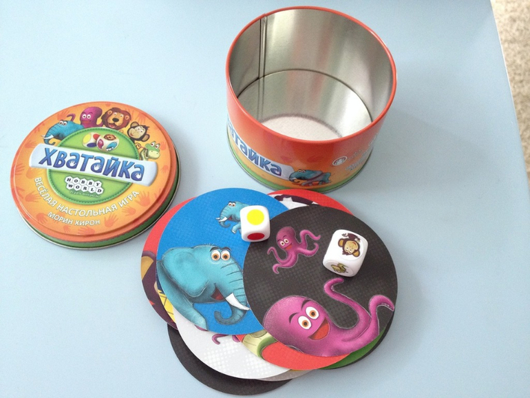 Хватайка. Как раз для нее нужен все-таки большой стол или место,чтоб одним слоем разложить кружочки. Сама игра простая. Кидаешь 2 кубика с животными и с цветом и кто быстрее схватит соответствующую карточку. Очень классная металличекая коробочка,очень удобно все придумано.