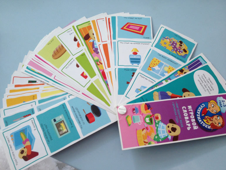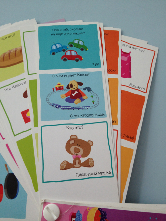 Далее идет веер от Клевера. уже изрядно потрепанный. Сын для своего возраста не очень хорошо разговаривает,поэтому этот веер нам вполне еще актуален по возрасту и задает много тем для обсуждения. Не все рисунки прям узнаваемы,но вполне симпатичные.И сам веер компактный,кинул в сумку и занимает мало места.