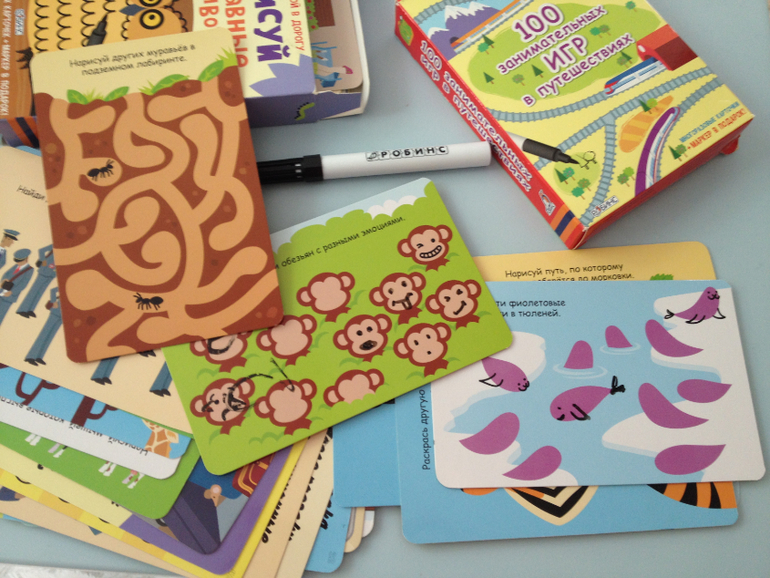 Начну с издательства Робинс. Прекрасная серия занимательных карточек великолепного качества. все задания очень интересные и разные,нужно дорисовать,решить,проложить лабиринт ,и тд. В коробочке прилагался водный маркер,который прекрасно стирается любой сухой салфеткой ну или пальцем на крайний случай. для меня еще огромный плюс,что оригиналы Робинс взяло у моего любимейшего Usborn, а для меня это гарантия креативности и красоты.