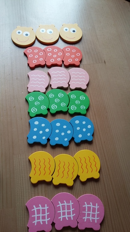 1. Детки кидают кубик и собирают свою гусеничку: Каждый игрок может взять из общей кучи только один раз деталь определенного цвета. Игрок пропускает ход, если на кубике выпадает цвет фрагмента, который уже есть у его гусенички. Кто первый соберет разноцветную гусеничку, тот и выиграл.