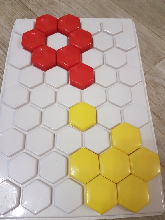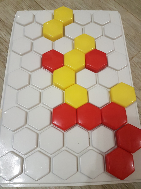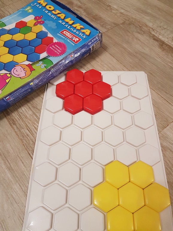 И вот по мотивам игры в уголки, сынулька придумал свой вариант игры фишками от мозаики, в которую сейчас дочка играет:)