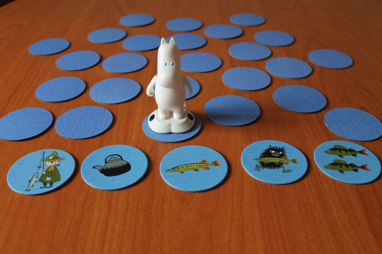 В игре 30 тайлов, 17 из которых с магнитом. Фишки выкладываются «водной» стороной, и начинается рыбалка. Если тайл, выбранный игроком, примагнитился к Муми-троллю, рыбалка была удачной. Поймать можно не только рыб, но и старый чайник. Тайл с рыбаком считается за тайл с рыбой, помимо этого, игроку достается доп.ход. Тайл со скунсом также считается за тайл с рыбой, но в этом случае каждый игрок возвращает «в воду» по одному своему тайлу, а все фишки перемешиваются.