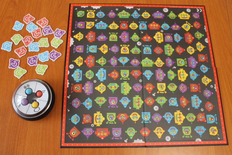 На игровом поле изображено 120 портретов роботов, отличающихся по цветам (одинаковых нет). В сфере с разноцветными шариками (5 цветов) есть 4 сектора: голова, глаза, рот и нос. Выпавшие цвета шариков напротив каждого сектора указывают, какого именно надо найти робота. Первый, кто верно найдет 5 роботов - победитель.