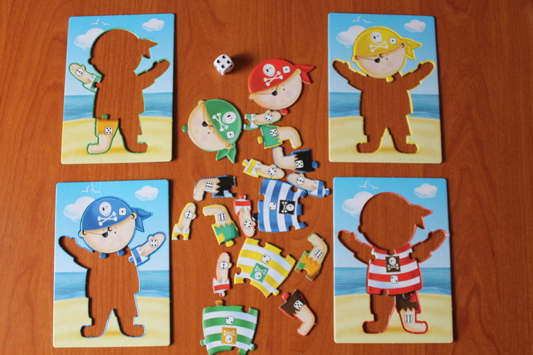Игры для самых маленьких. В зависимости от выпавшего значения на кубике, игрок устанавливает на свой планшет соответствующую часть пирата.