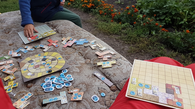 Красота))) Старший сегодня спутник-гения собирает. Решил чередовать поля:прямоугольное, пирамида, соты ))). А всё утро рисовал спирографом - тоже тишина - только слышно как ручки скрипят )))). А про доигрались - принёс кубик-антистресс, который с кнопками/колёсиками и говорит, что игру придумал. Кубик бросаешь если выпало 5 кнопок - прыгать пять раз, если "крутилка" то вертеться, если большая кнопка - приседать, а если выемка, то пропускаешь ход ))). Тут же подключил мелкого : бросают кубик на диван и выполняют задания )))
