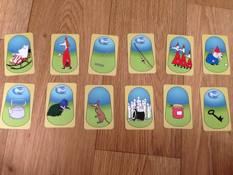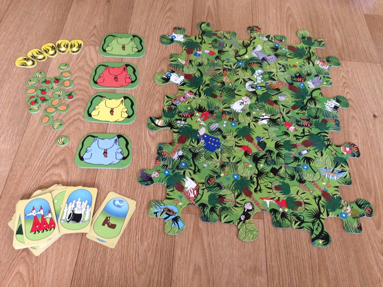 Каждый игрок получает рюкзак, затем по очереди из колоды берется карта и надо найти предмет или героя "в джунглях". Кто первый найдет, тот получает жетон с фруктом и кладет в свой рюкзак. Если на карточке изображена комета рядом с предметом, то при итоговом подсчете очков она приносит больше баллов,чем фрукт. Вот пример карточек: