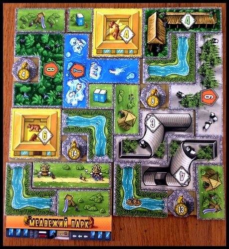 Игра Медвежий Парк во многом похожа на популярные Пэчворк и Cottage Garden. Целью игроков снова будет лучше всего заполнить свой игровой планшет различными геометрическими фигурами. На этот раз это будет зоопарк, в котором вы строите вольеры различных видов медведей. Плитки с общего поля в середине стола игроки получают, закрывая клетки с изображениями тачки, бетономешалки и экскаватора на своём планшете. В зависимости от типа закрытой картинки, игрок может выбрать детальки, различные по размерам и ценности. Кроме того, для расширения территории вашего парка нужно закрыть клетку со строителями.