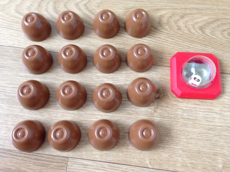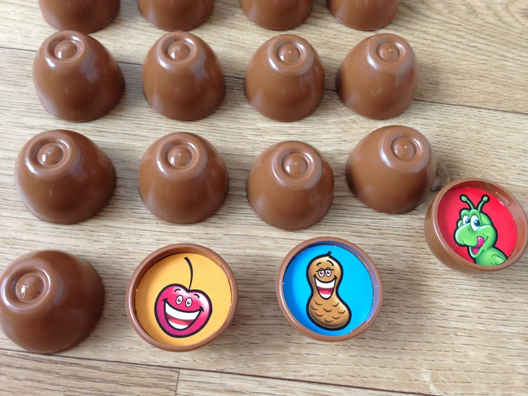 В игре 16 конфет с разными начинками: с орехами, вишней и одна с гусеницей. Конфеты сделаны из пластика, что очень хорошо подходит для малышей, картинки снизу из плотного картона.