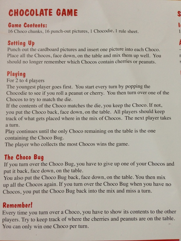 На кубике может выпасть орех - тогда надо найти конфетку с орешком или вишенка - тогда надо найти конфету с вишенкой, если взял не ту конфету, то положить ее на место и запомнить. Если выпала гусеница, то надо вернуть одну свою конфету и гусеницу обратно на стол и перемешать. Побеждает тот,кто соберет больше конфет.