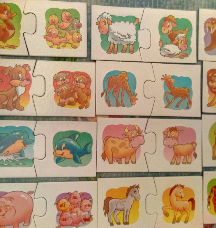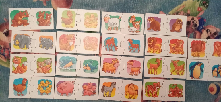 А еще радуюсь, что не купила про Мам и малышей, хорошо, что вспомнила про такие игры от степ пазла.Они, конечно, не такие как джеко, но тоже очень симпатичные и по цене очень и очень демократичные. У нас есть Чей малыш и Профессии, как раз еще дочкин. В наборе мама и малыш 18 сдвоенных карточек, животные узнаваемы)