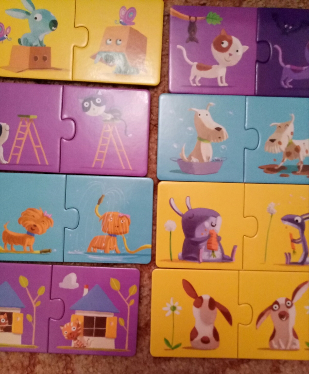 Пазлы повторяющиеся по цвету, замки совпадают, противоположности порой не очень понятные, даже я первый раз запуталась что куда)