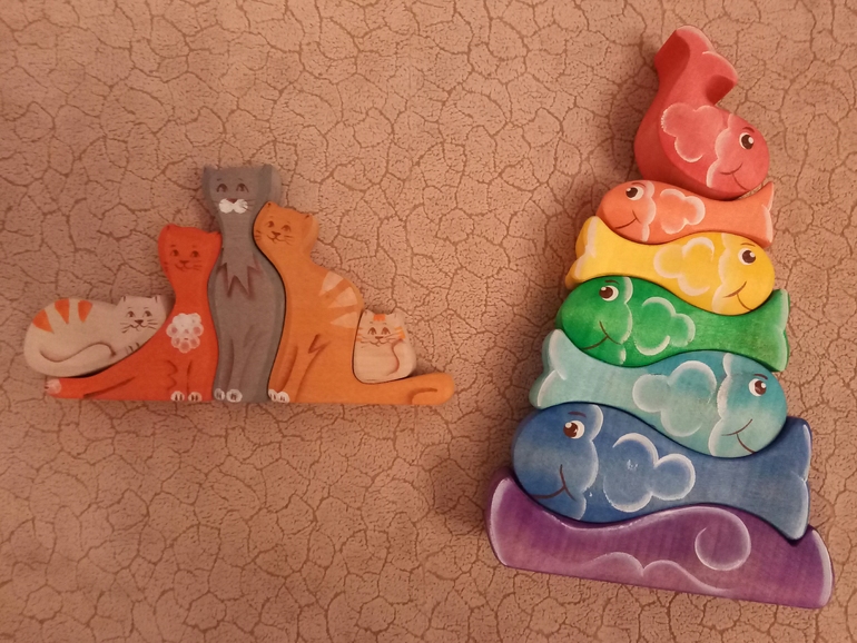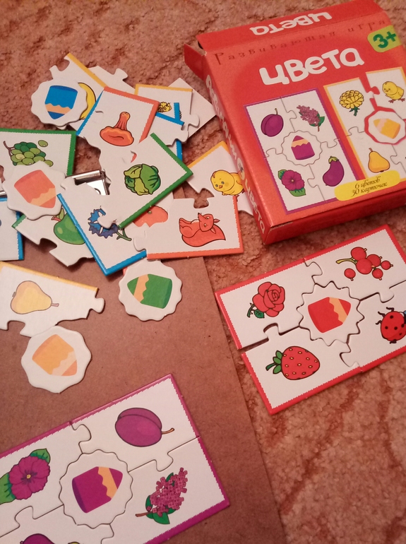 В наборе 5 пазлов-карандашей, и к ним нужно присоединить предметы соответсвующих цветов. У каждого цвета свой рисунок пазлы. Качество среднее, пазлы скрепляются не очень.