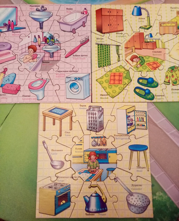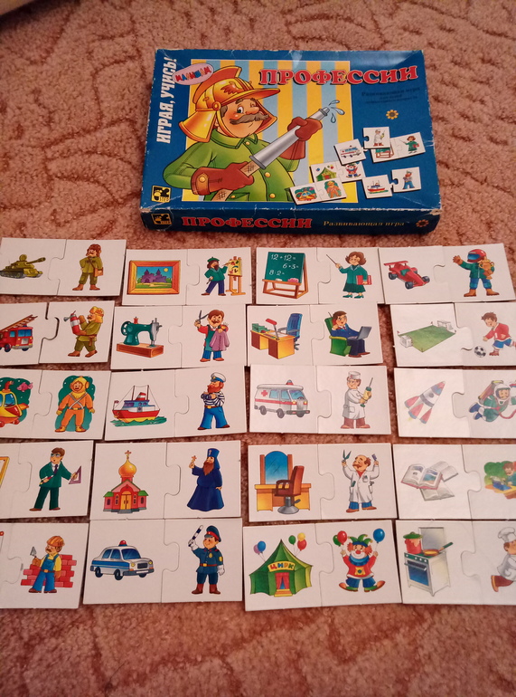 В наборе 20 двойных карточек. И почему то только сейчас я заметила, что он мальчуковый какой, женская профессия только учитель, на остальных карточках вкалывают мужчины) и повар, и портной, и бухгалтер) есть и любимые мальчишеские гонщик, танкист, космонавт. Мы уже с интересом его собираем.В дальнейшем, конечно, много чего можно по ним обсудить. Пазлы не очень толстые, собираются легко, держатся хорошо.