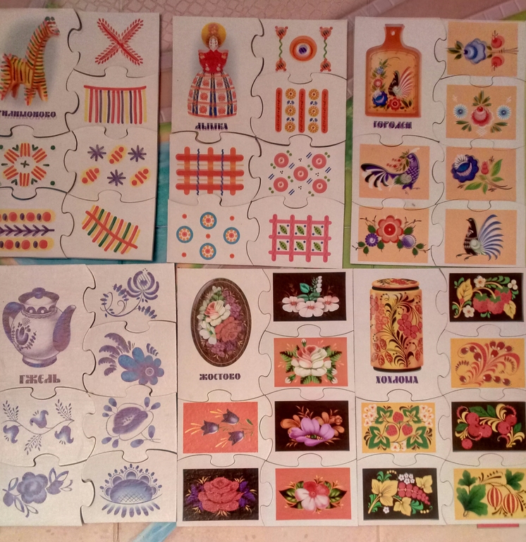 На одном нарисован предмет с определенной росписью и надо подобрать соответствующие рисунки.Представлены Хохлома, Жостово, Дымковская роспись, Филлимоновская, Гжель, Городецкая. Пазлы каждый со своим рисунком.