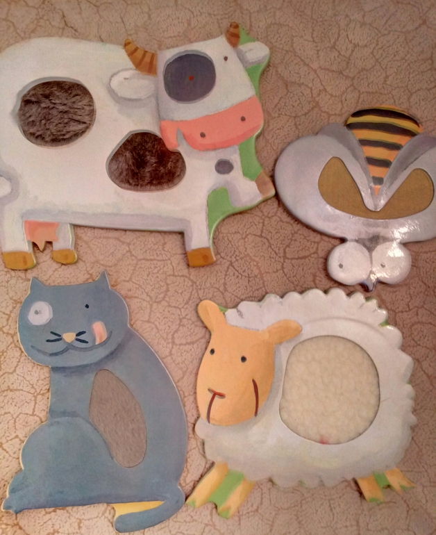 Сам пазл из 12 квадратных частей, и еще 8 вынимающихся фигурок животных как раз с тактильными вставками. Размер пазла смотрите сами)