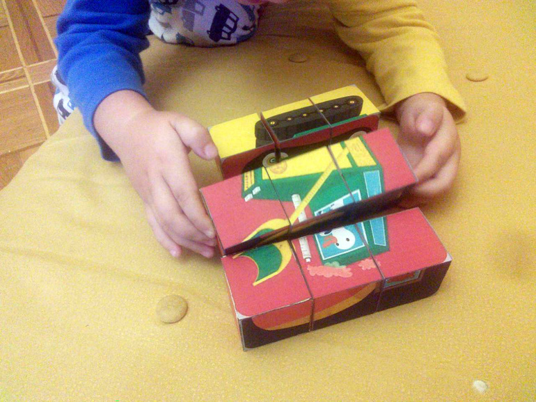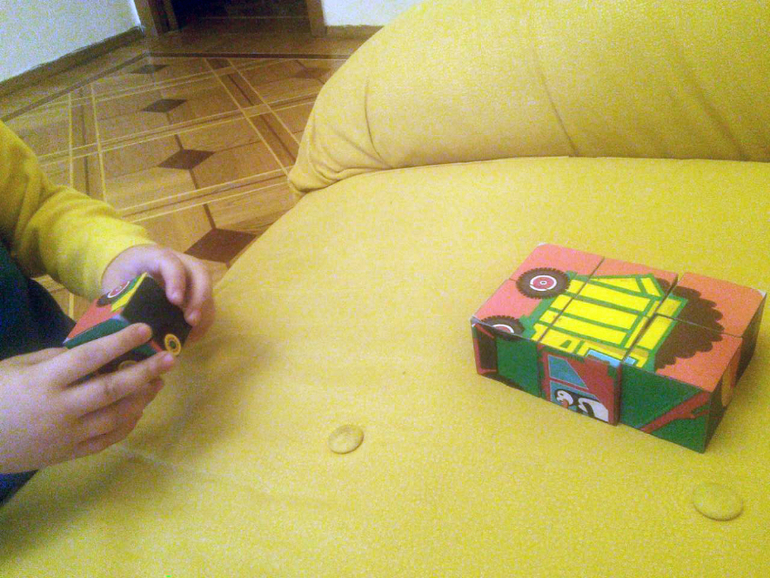 Вроде простая для 3,6 задача - сложить картинку из 9и кубиков. Тоже сомневалась, делать или нет. Тем более, что у нас уже есть кубики с транспортом. Но сделала и не прогадала. Сыну очень понравилось. Оказалось, не так уж и просто выискать все элементы машинки без картинки-образца и приложить их друг к другу под правильным ракурсом. С учетом того, что все картинки на кубиках довольно однотипны.