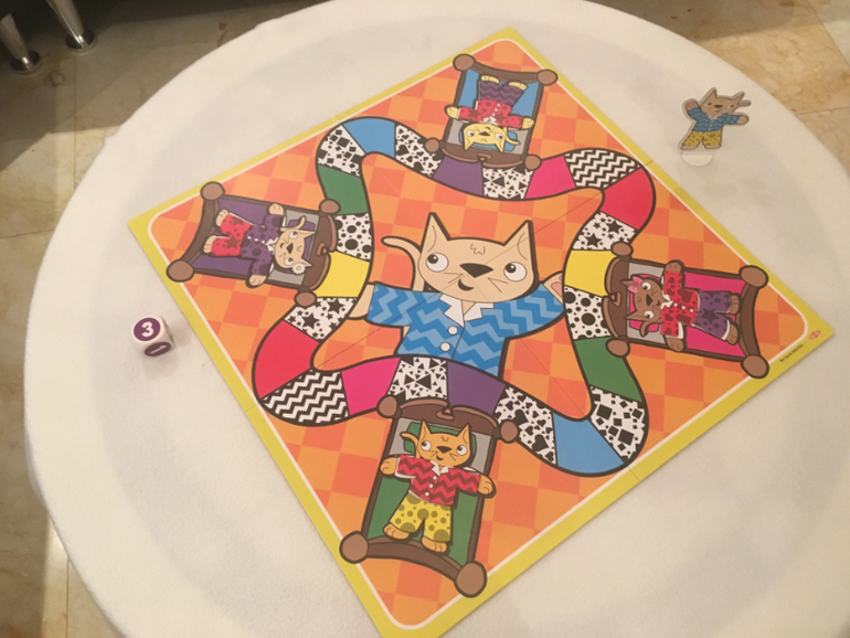 15) котята в пижамах. Оригинальные идея и воплощение, процесс интересует, но пока не совсем понятен. Задача - раздеть котят-малышей. Для этого бросаем кубик, а кот Пушок (справа) выполняет роль фишки. Игроки отыскивают на пижамах своих котят тот орнамент или цвет поля, на котором Пушок остановился. Игра на внимание и наблюдательность. Я для начала уменьшила количество пижамок.