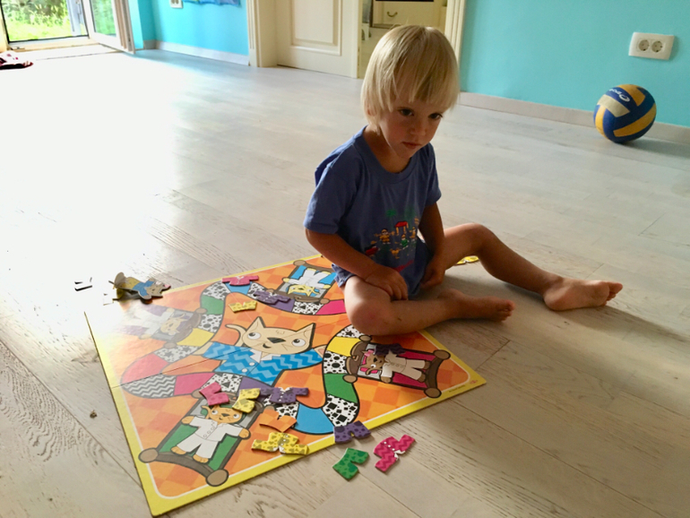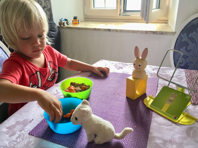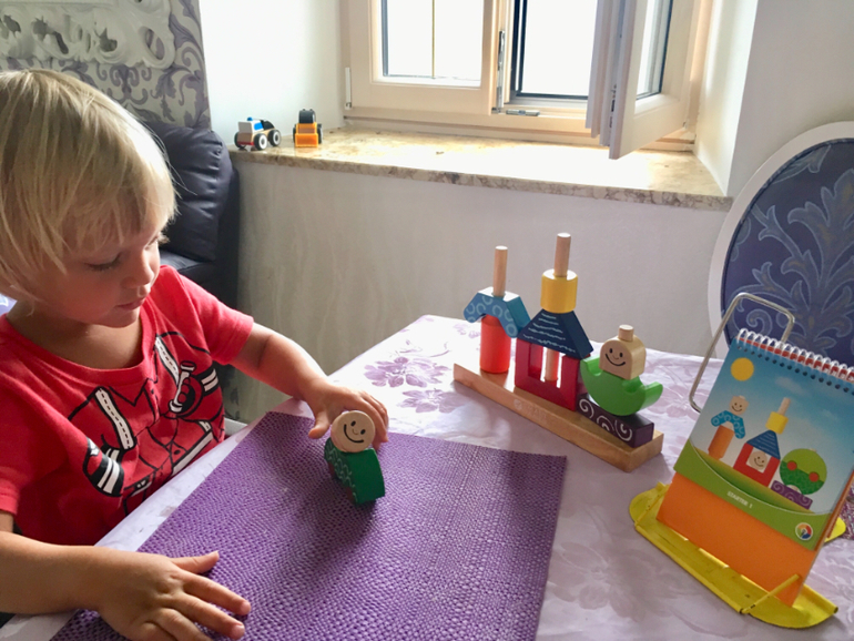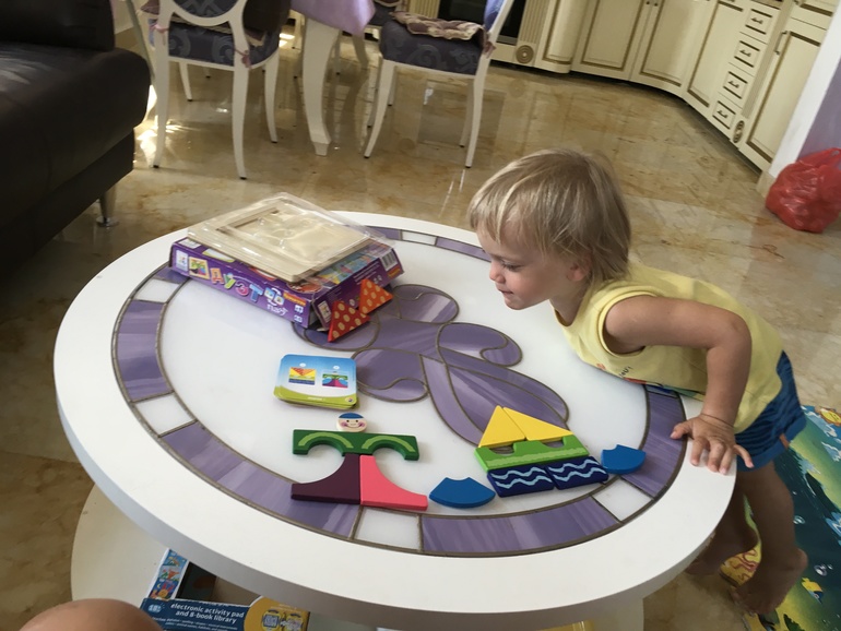 10) теперь о парочке игр, так называемого «головоломного» типа. Застенчивый кролик от Бондибон - одолели первый уровень на сегодняшний день. По картинке надо воспроизвести положение кролика и деталей. Он мил, поэтому тискали его с двух лет и играли в сюжетно-ролевые. Игра развивает пространственное восприятие, знакомит с понятиями верх, низ, сзади, спереди и др. Развивает внимание. У нас хорошо идёт с обыгрывание каждой ситуации.