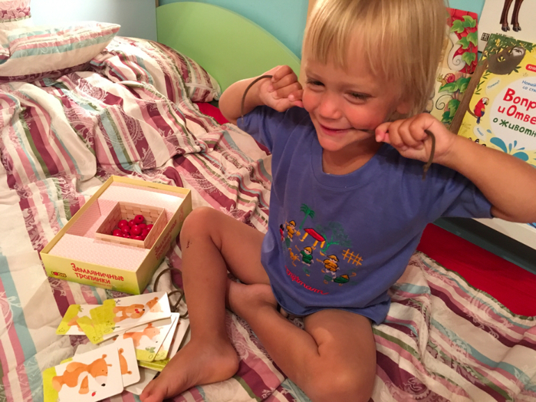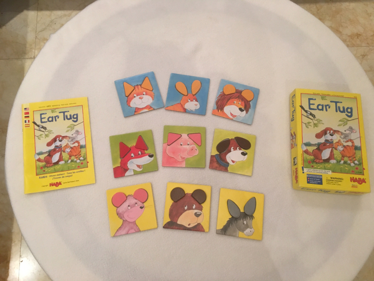 8) Игра Ушки от Хаба. Отношу ее к «пазловым» играм, особого интереса к которым мы не испытываем. Нужно подобрать зверью по цветам деревянные либо картонные Ушки, которые тащишь из мешочка. По фото все ясно.
