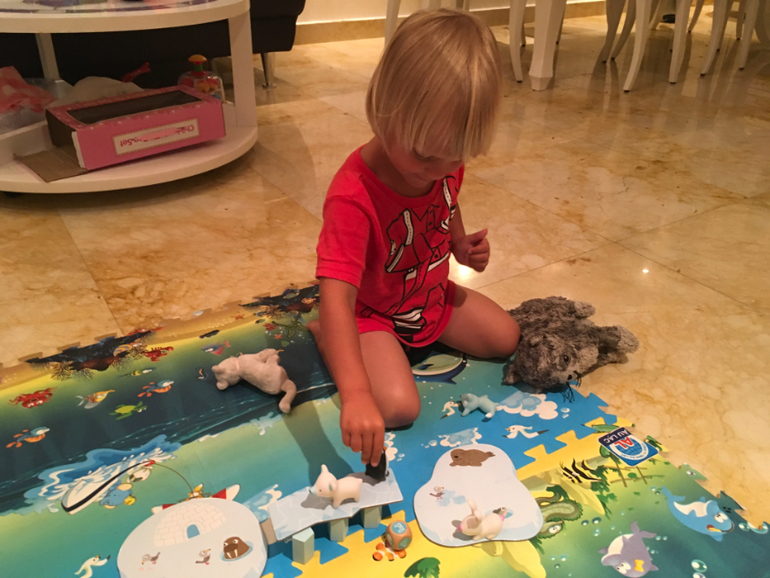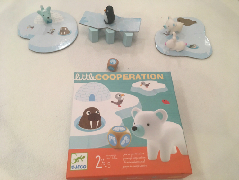 Открыли в 2, 6 , правила понял не сразу, но после пары раз разобрался. Играем с интересом. Джековская Фишка - зверушки-очаровашки, не можем равнодушно пройти мимо. Ходилка в два хода) задача - помочь им перепрыгнуть с льдины на мостик, с мостика - в иглу. На кубике по две грани каждого из вариантов - прыгнуть на мост, переместиться в иглу или частенько выпадает крушение моста, который держится на 6 сваях. Каждый раз падает по 1 свае. Мост рушится, звери соответственно падают за компанию, ребёнок может расстроиться... тогда вызываем команду спасателей и спасаем зверей.