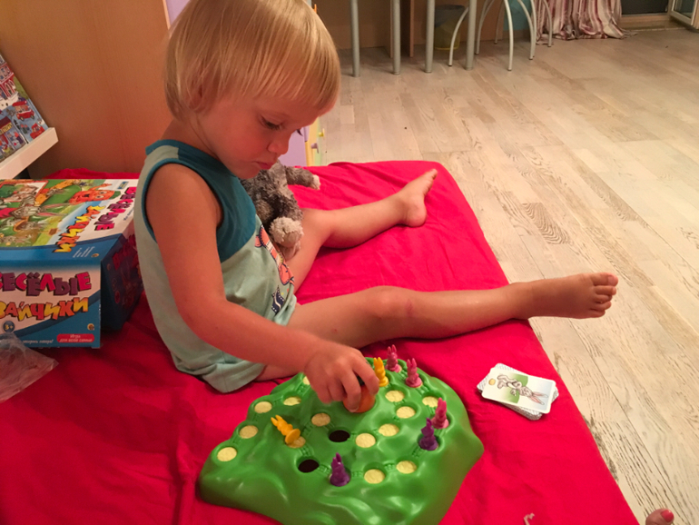 Веселые зайчики - у нас аналог от Рыжего кота. Смысл не совсем ясен, но процесс интересен. Механизм гипнотизирует. Если не сломаем, когда-нибудь дойдём до настоящих правил - добраться зайцами до вершины холма, не смотря на коварные ямки, которые периодически открываются , благодаря повороту того самого механизма.