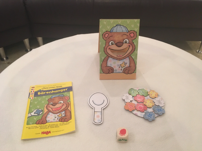 3) В Голодного медведя от Хабы мы начали играть довольно рано - использовали в качестве сортера после года. Затем попытались поиграть по правилам. Они элементарны. Задача - накормить Мишку выпавшим на кубике продуктом питания. Можно кормить ручками, а вот с плоской ложечки это сделать гораздо труднее. У нас получается через раз. Игра развивает ручную координацию и мелкую моторику. Можно усложнить правила и перевернуть фишки с едой обратной стороной. Получится вариант с эффектом Мемори.