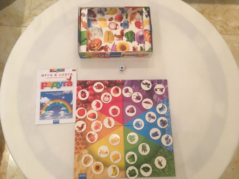 6) Конфетки ELC - начали играть немного после двух, правила понял сразу, два кубика с цветными гранями кидаются одновременно - выпавшие цвета - двухцветная обертка от конфетки, которую нужно найти. Конфет много, поэтому терпения хватает ненадолго. Рекорд на сегодняшний день - пять конфеток от силы. Игра требует зрительного напряжения и внимания.