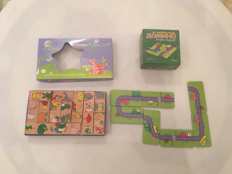 20) есть у нас здесь с собой ещё парочка домино. Одно пазлового типа Половинки и В путь дорогу. По правилам пока не играем, строим дороги и извлекаем новые машинки.