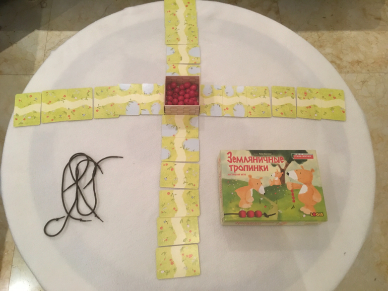 Игра требует готовности свободного овладевания счетом до 10, к чему мы ещё пока, конечно, не очень готовы. Карточки с различным количеством ягод раскладываются «дорожками» от лукошка к каждому игроку. игрок , поднимая карточку, нанизывает на свой шнурочек ровно столько ягод, сколько обозначено на поднятой карточке. Последние в ряду - землянички, которые нужно отдать медвежатам. В конце подсчитывается количество ягод у игроков.