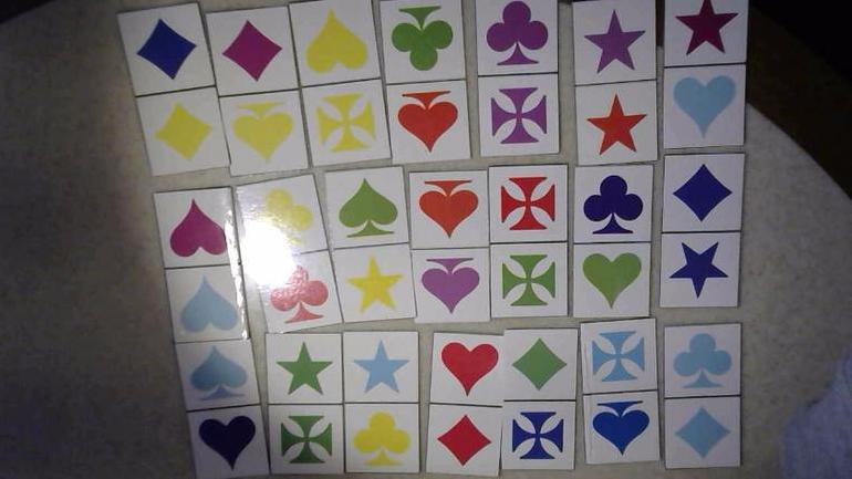 Это обычное домино, которое играется либо по цвету либо по форме. В книге есть третье домино - двух цветное. Я отсканирую всю книгу и выложу.