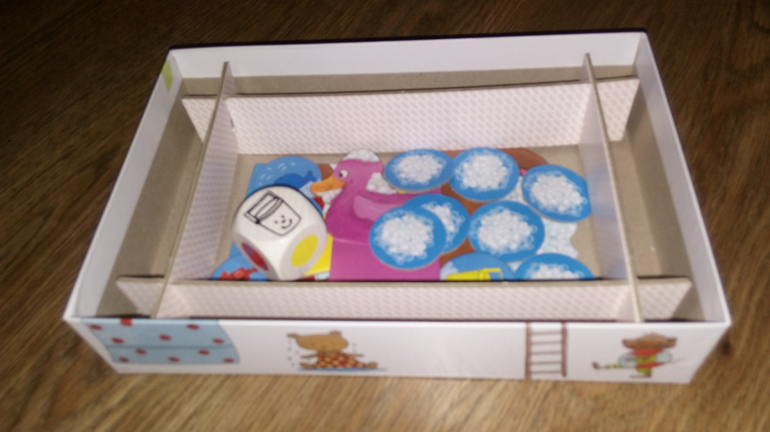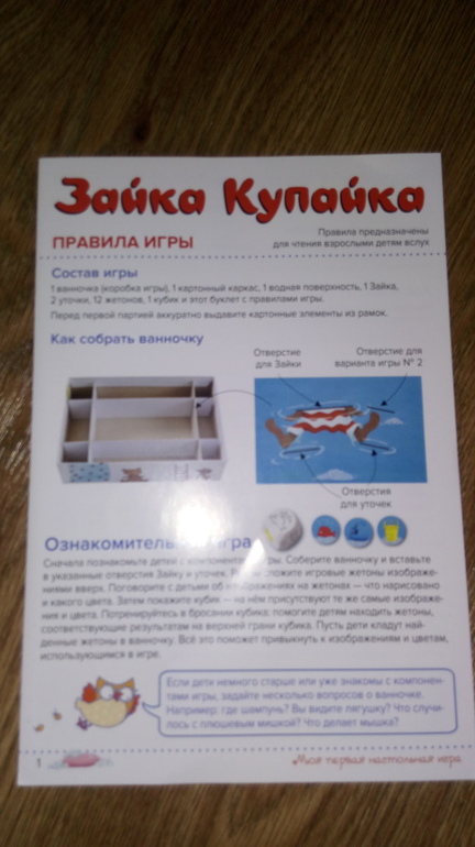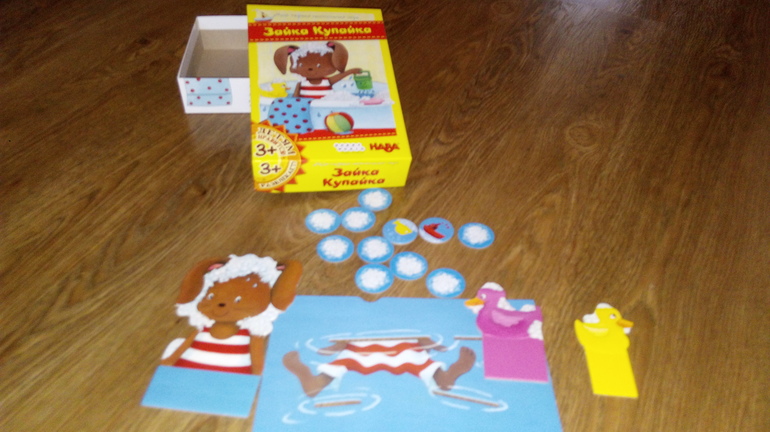 Ванночка( сама коробка), здоровенный кубик, картонный каркас, вода( картон)), зайка, 2 утки, 12 жетонов
