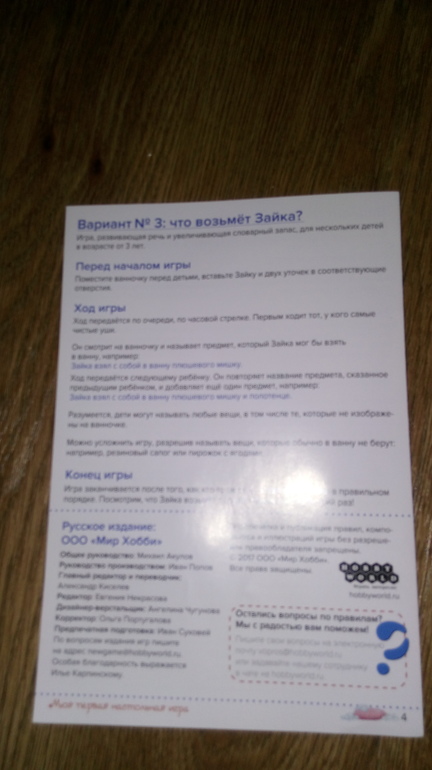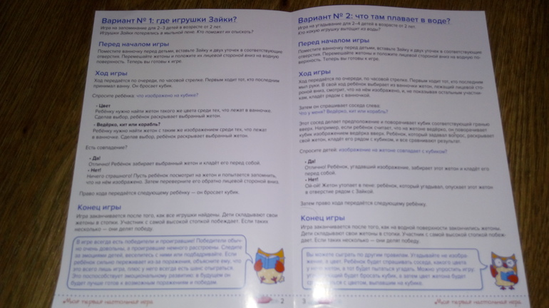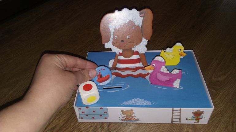 2.Жетоны кладем на воду ,переворачиваем лицевой ст вниз,игрок выбирает жетон и смотрит, чнеина нем. Не показывая , кладет рядом с ванной и спрашивает: что у меня?ведерко, кораблик или кит? Сосед предполагая переворачивает кубик на соответ.грань. Если угадал, забирает жетое себе. Если нет, бульк, в ванну.