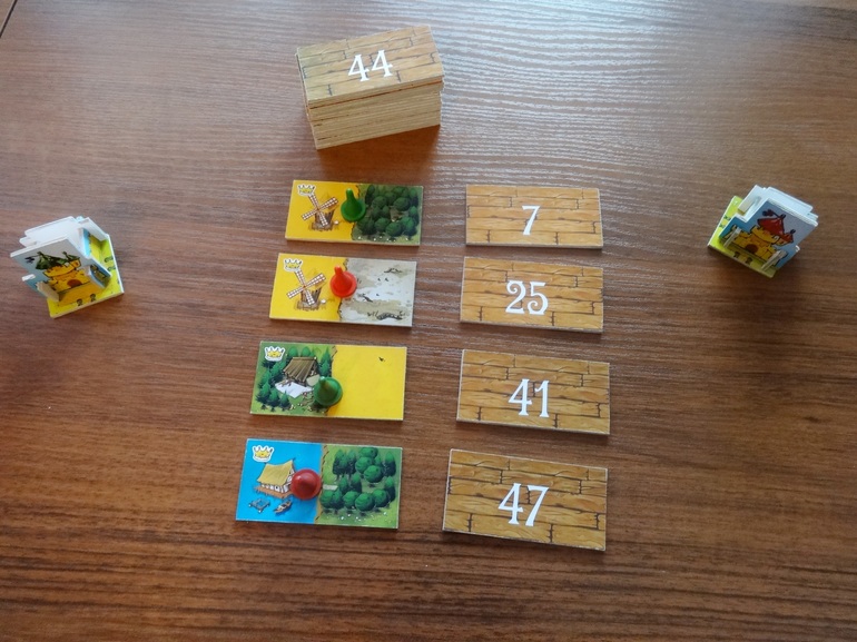 Чаще всего мы играем вдвоем с дочкой, в таком варианте используется только половина всех тайлов (24 из 48 при составлении квадрата 5*5. Составлять 7*7 мы пока не пробовали), и оба игрока в ходе каждого раунда выбирают по 2 тайла (по две двойных "фишки") местности.