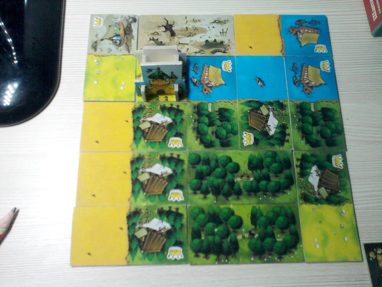 Все тайлы я наклеила на плотный картон, а фишки взяла самые простые. Иногда мы в качестве королей берем миплы из Каркассона, но как показала практика, дочкке все равно, какую фишку выставлять. А мне тем более.