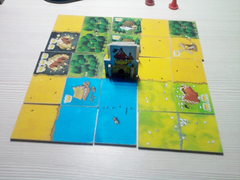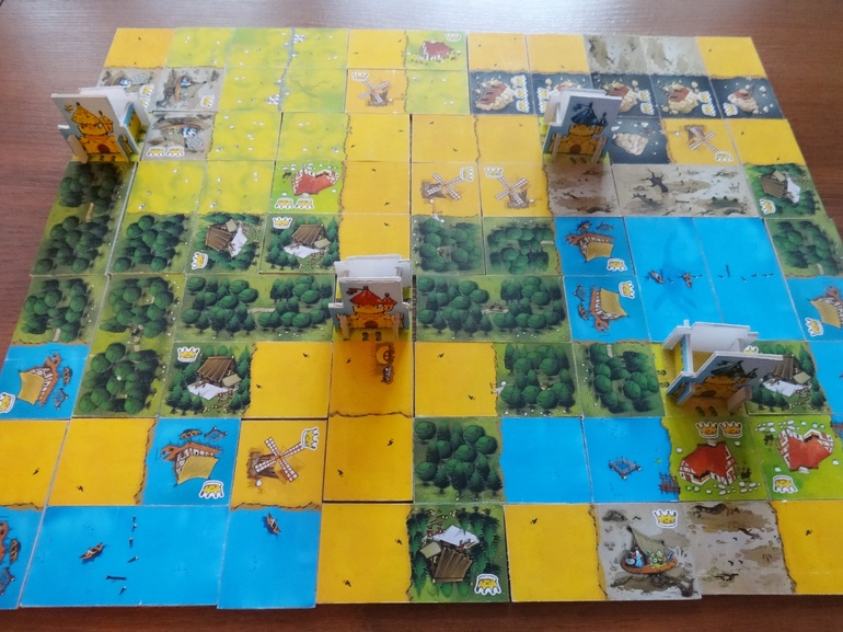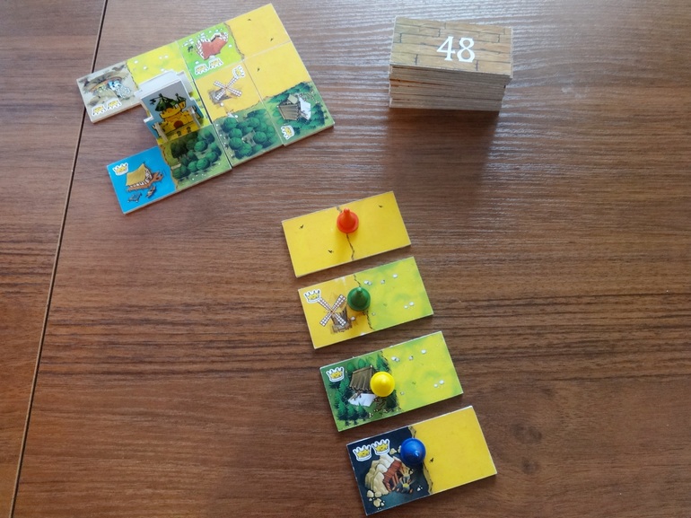 При таком раскладе, если ты выбираешь последним, то может достаться тайл, который даже и пристроить некуда. То есть конкуренция гораздо выше, красиво "застроить" свои земли не всегда получается, бывает, что приходится выбирать меньшее из двух зол. Вот где надо по-настоящему ломать голову, что в данный момент выгоднее взять и куда поставить! Та еще головоломка.