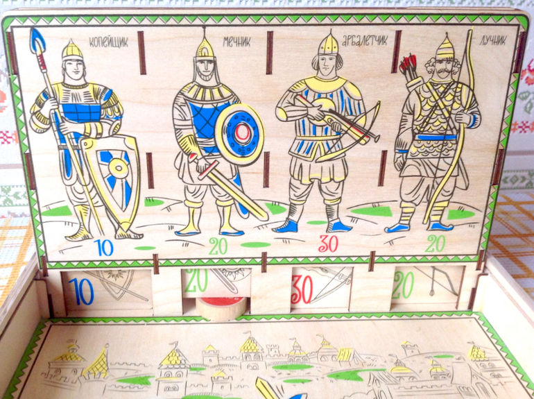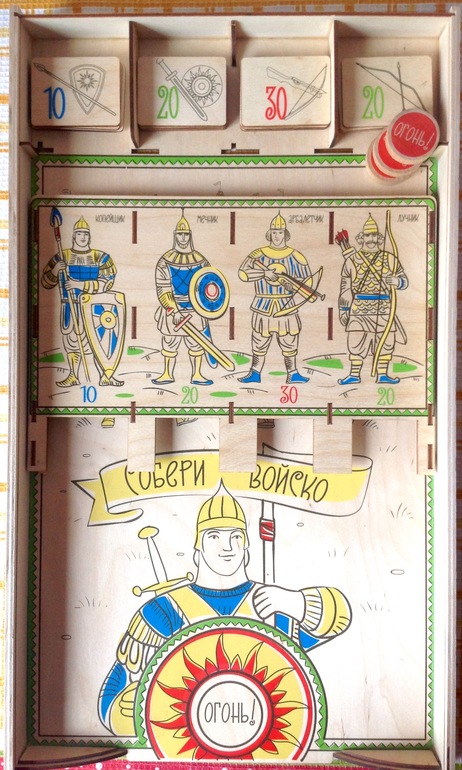 Цель игры собрать большее количество очков, то есть больше воинов в своё войско. Всего 4 вида бойцов: Копейщик, арбалетчик, мечник и лучник. Щелчком пальца мы выбиваем фишку и забираем её себе. В конце раунда подсчёт. Размер ячейки у воинов разный.