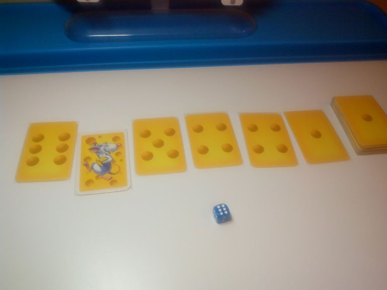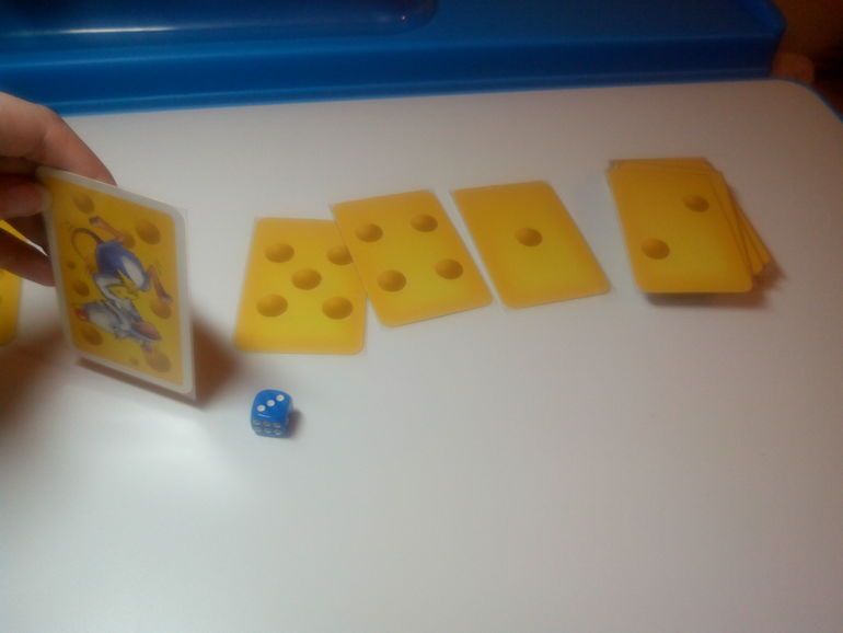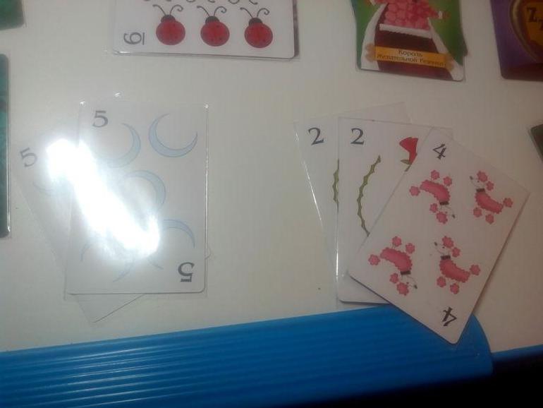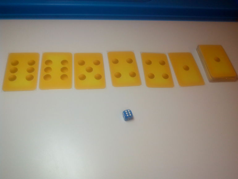 И обучать счету можно, и просто интересно играть. Раскладываются в ряд карты рядом со стопкой общей, кидаем кубик: