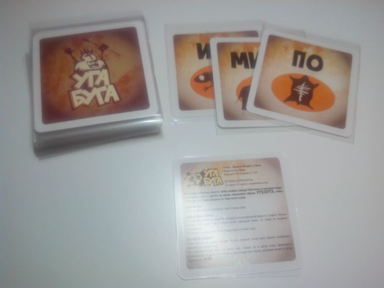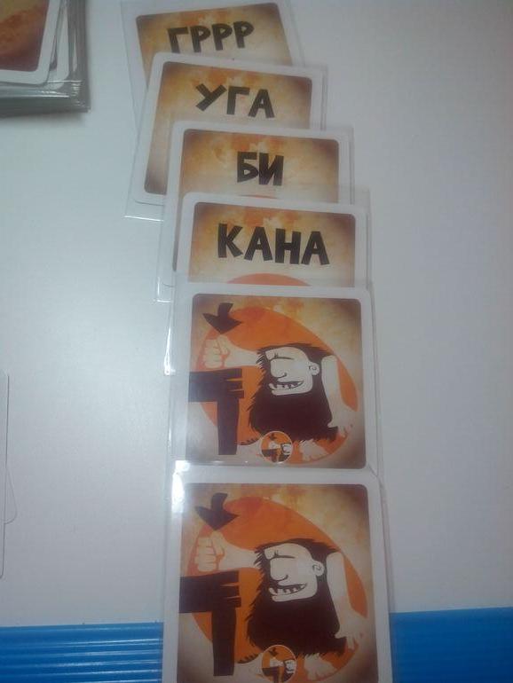 Вот уж где приходится память напрячь, причем соображать быстро нужно:)игра для 3-8 игроков. раздается по 3 карты. Выкладывает один игрок и произносит слово, что написано, бросает вызов другому игроку, указывая на него и произнося "ха!", затем следующий повторяет первое слово, свое новое и вновь добавляет "Ха!" , указывая на другого. Есть и карты действия, такие как "высунуть язык"\"повторить звук или действие предыдущее"\"хлопнуть в ладоши"\"стукнуть кулаком по столу". Если игрок кладет свою третью (последнюю) карту и ему удается правильно повторить все слови он кричит "Уга-буга!", после этого все карты в центре стола раздает как штрафные другим игрокам.